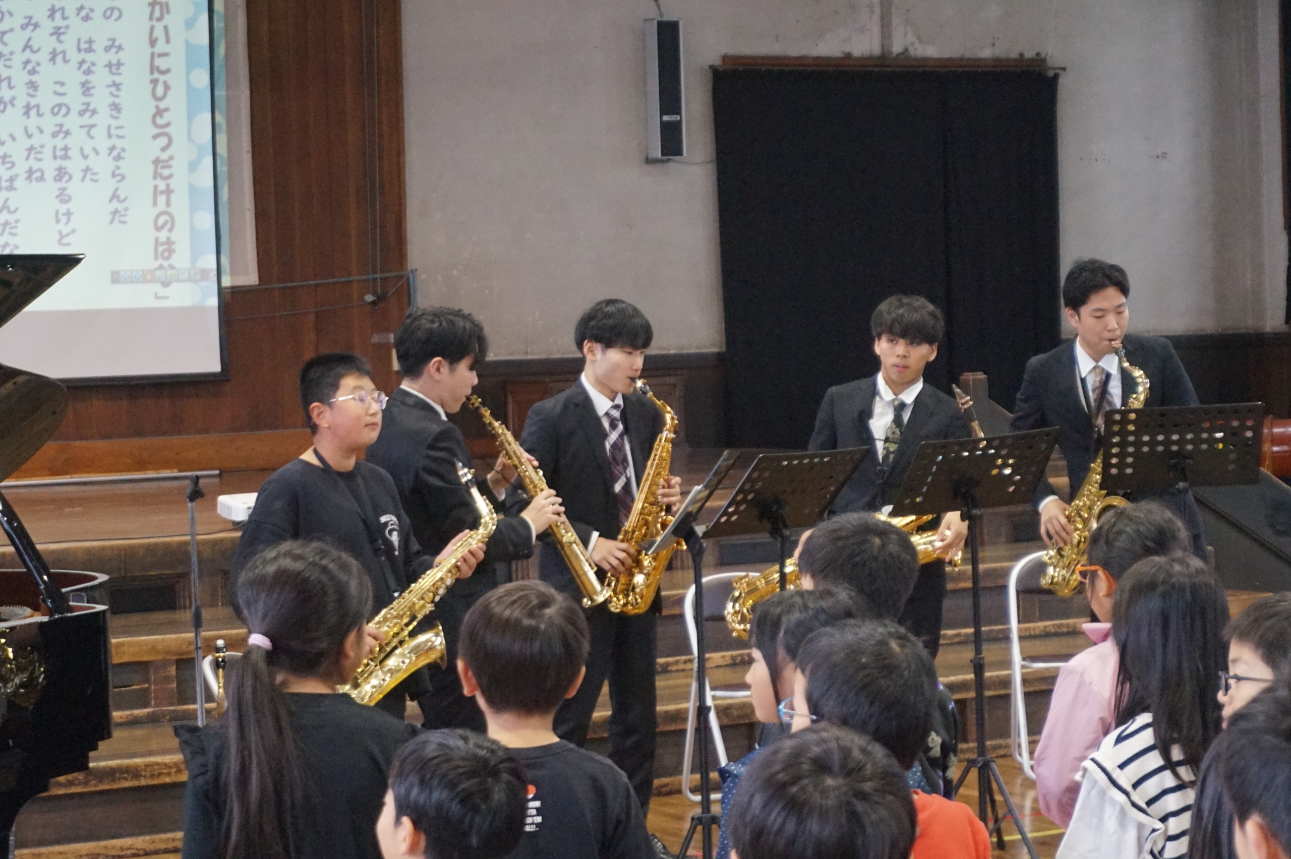 10月の終わりに、サックスの演奏会が行われました。今年度で3回目の演奏会で、今回はサックス四重奏に加え、ドラムやピアノも加わってとても豪華な演奏会となりました。卒業生がこうして母校で演奏することで、子どもたちの憧れや目標にもなりました。生の演奏を目の前で聴くことができ、感性が磨かれました。
