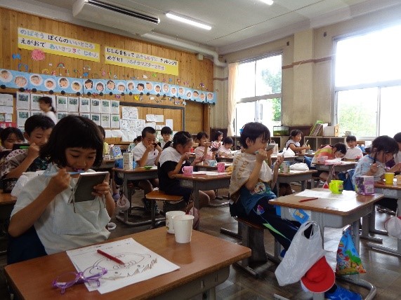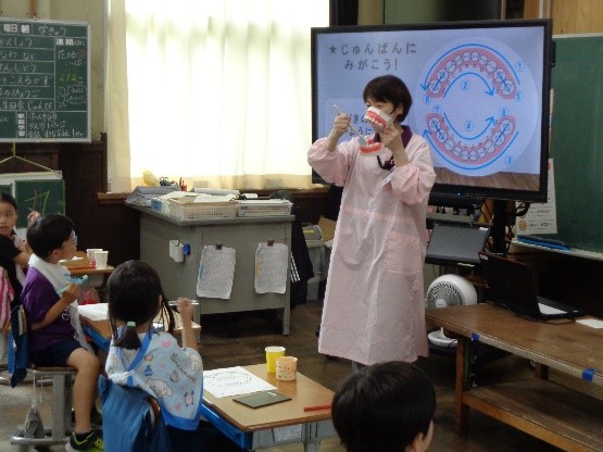 7月初めに行われた、歯の健康週間中に、保健師さんにお越しいただき、歯科指導を行いました。今回は、虫歯を予防するための正しい磨き方を教えていただきました。子どもの歯から大人の歯に生え替わり途中の子どもたちの歯ですが、その大人の歯は、おじいちゃん、おばあちゃんになっても使う大切な歯です。正しい磨き方を教えてもらうと、鏡を見ながら一生懸命に磨いていました。