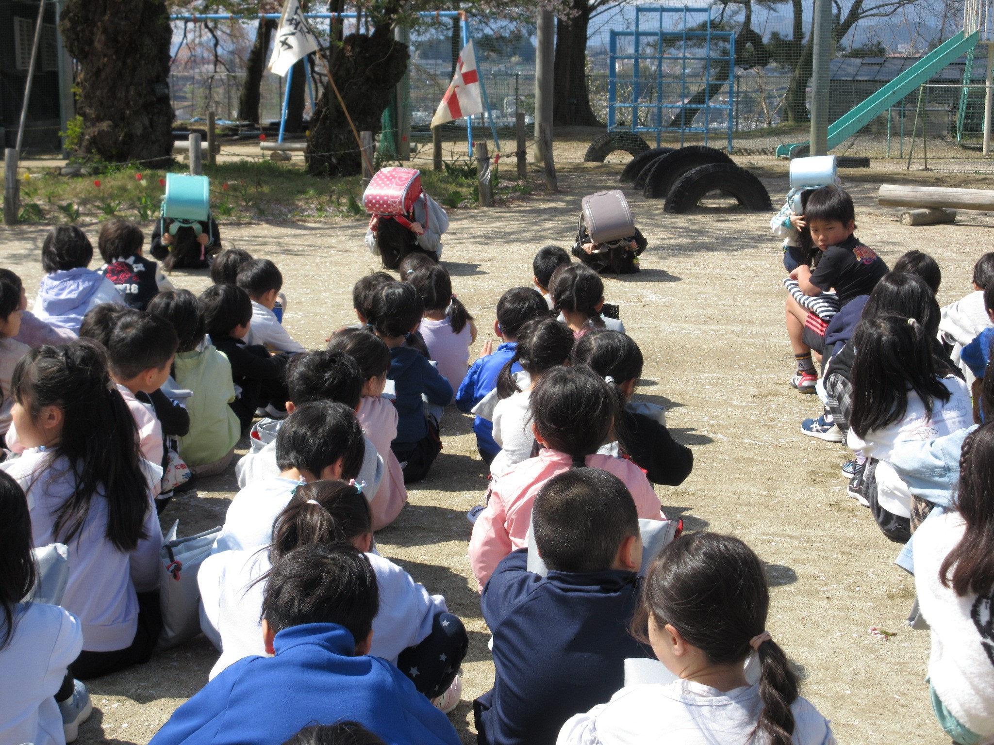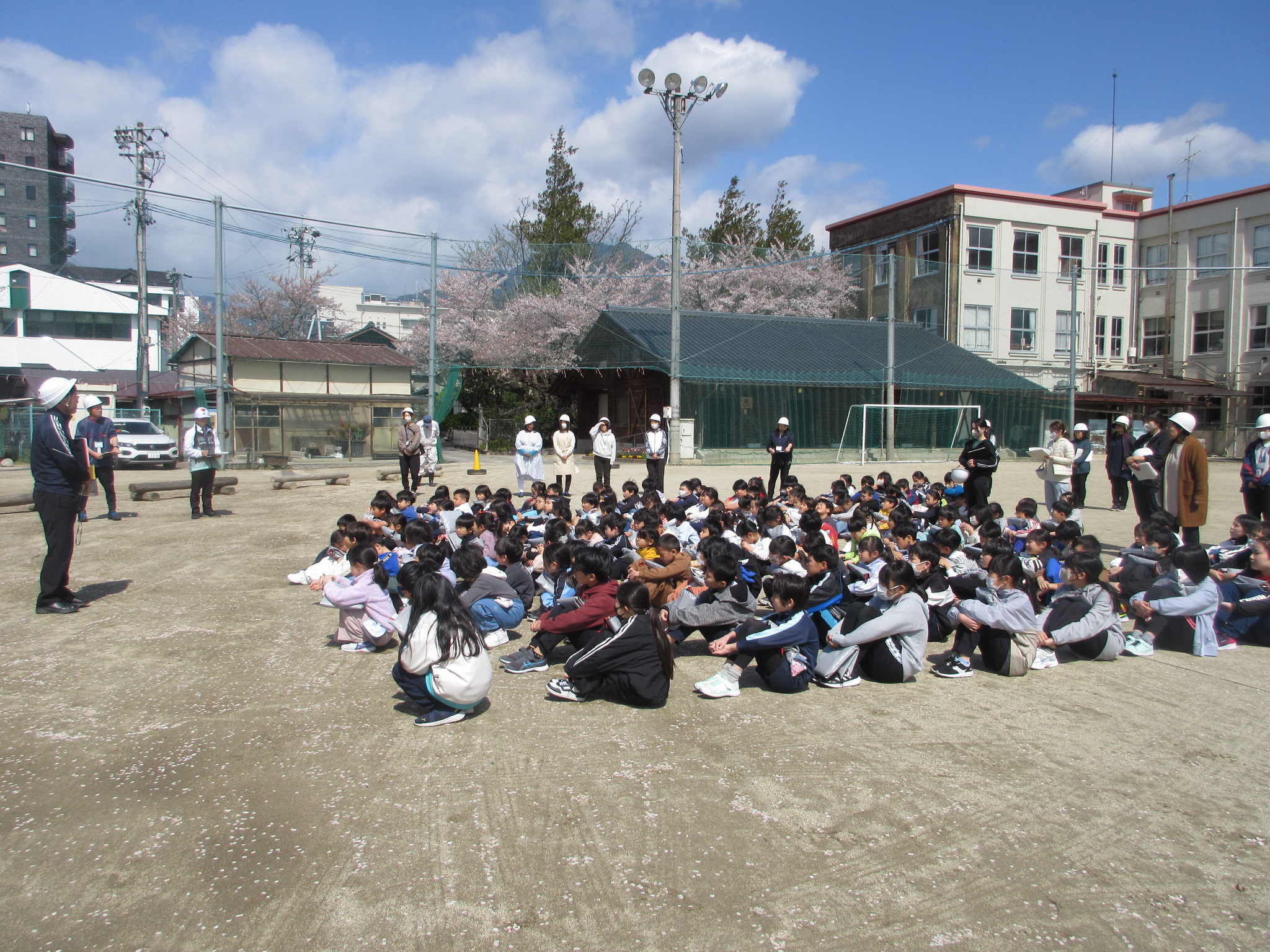 4月に今年度はじめての避難訓練がありました。「学校で火事があったらどうする?」と問いかけると、「にげる!」「命をまもる!」「お・は・し・も だよね。」と次々に答える子どもたち。避難のあいことば「お・は・し・も」のことをよく知っていました。なぜ、おはしもを守らなければいけないのかをしっかりと予習してから避難訓練を迎えました。非常ベルが鳴ると、さっと口を閉じる子どもたち。真剣に校庭に避難することができました。先生方が係の活動をしていて待っている間も静かに待つことができました。命を守るためには、もっと早く、もっと放送をよく聞いて、もっと判断力を鍛えていかなければと思います。もしも火事が起きたら・・・もしも地震が起きたら・・・お家でも話題にしてみてください。