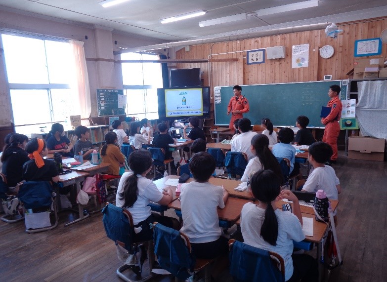 防災の日にちなんで、今年度も「防災学習」が行われました。消防署の方に来ていただき、煙体験や119番通報などを行いました。