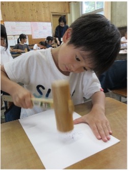 「あさがおさん、もう枯れちゃった。」と切なそうにあさがおを見つめる姿があり、今のあさがおさんを残したいという気持ちが高まってきた子どもたち。綺麗なあさがおさんを残すために、1人ずつたたきぞめを行いました。自分のお気に入りのあさがおを取ってきて、広げられるように切ってサイズを調節し、色がうつるように木づちで叩きました。「うわぁ!こんなに色がつくの!?」「みてみて!こんなに綺麗にできたよ!」と、鮮やかな色に染まり、とても嬉しそうな様子でした。そろそろ、あさがおさんの姿が終わりに近づいてきました。大切なあさがおさんをどのように残すかみんなで話し合っていきたいと思います。