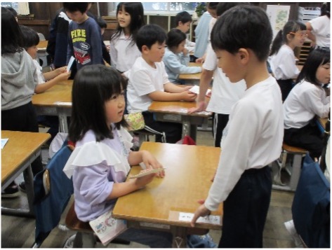 1年生の時に育てたあさがおさんの種を次の1年生に渡したいという思いのもと、手紙や育て方を書いた種袋や、どんなふうに育っていくかの発表を準備してきた子どもたち。とうとう渡しに行きました。渡したときに1年生が「ありがとう」と言ってくれたことが何より嬉しかったようです。そして、1年生から「種をくれてありがとう」「大切に育てます」とお話があり、2年生も「どういたしまして!」「困ったら聞いてね」とお返しをしていました。あさがおさんを大切に育てていた子どもたちの気持ちが1年生にも繋がり、またきれいな花がたくさん咲くのが楽しみですね♪