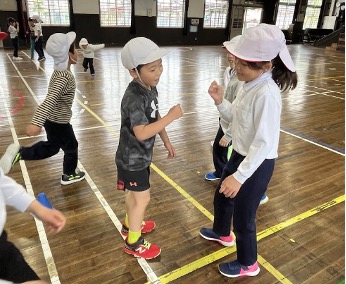 体育でぐるぐるじゃんけんという遊びをしています。じゃんけんの部屋で勝つと、走ったりジャンプしたり手をつないでジグザグ走りをしたりしながら、次の部屋に移っていくというものです。止めなければずっとぐるぐるやり続けているのでは・・・?みんなでとても楽しんでいます。