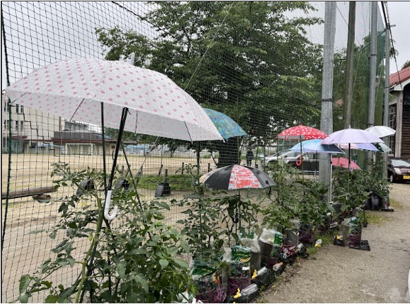 大雨が降ったある時、ある子たちが「先生、野菜に傘をさしてもいい?」と。雨に濡れながら一生懸命に傘を支柱にくくりつけ、大雨から野菜を守ろうと行動しました。その様子を見た他の子たちも「僕も私も傘をさしてくる!」「じゃあ教えてあげるよ!」と。子どもたちが力を貸し合って傘を立て、今では何本もの傘が野菜を守っています。子どもたちの愛情の元、日々大きくなっていく野菜たち。だんだん実も大きくなってきました。収穫が待ち遠しい子どもたちです♪