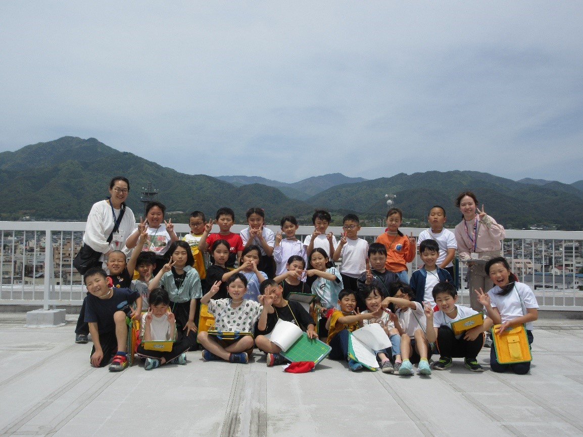 みんなで合同庁舎の屋上へ登らせていただいて、自分たちのお気に入りの場所を見つけたり方位を調べて何が見えるかを確認したりしました。追手町小はいろんな建物に囲まれていたり合同庁舎の南側にあるということに気づくことができました。