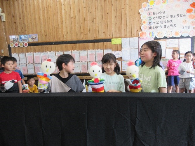 自分の人形が完成しました。そして、通し稽古が始まりました。子どもたちは、初めてとは思えないほどで、「けこみ」という舞台を自分たちで協力してどんどん用意できるようにしたり、劇のセリフを伝わるように言ったり素晴らしい姿がとてもあります。そろそろ講堂で練習をできたら良いなと思っています。講師の先生に教えていただき、子どもたちは日々レベルアップしています。台本もそろそろ覚えられるといいです。おうちでの励ましもよろしくお願いします。