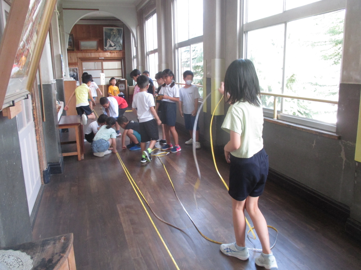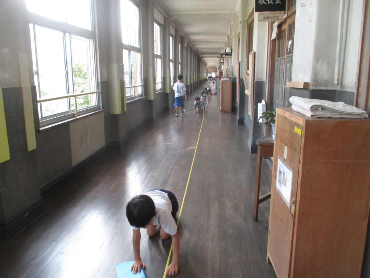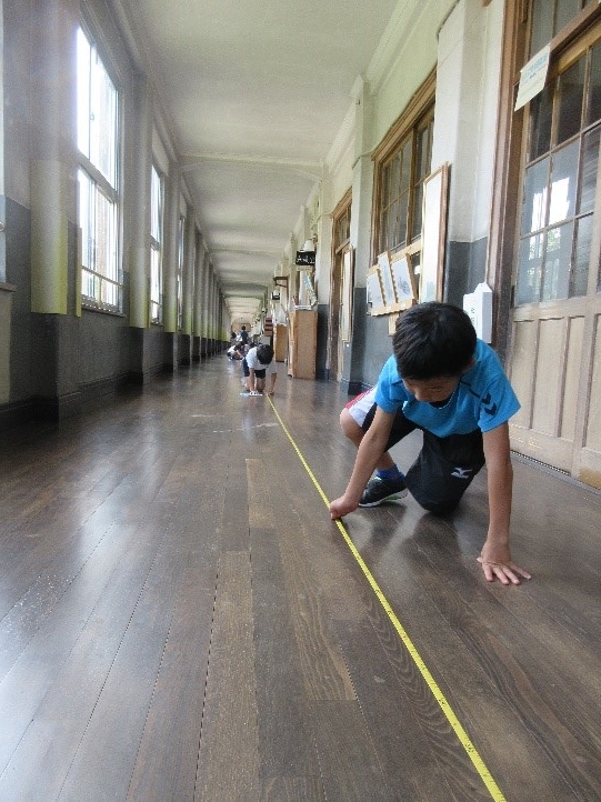 算数の「長さ」の学習で、追手町小学校の廊下の長さを測りました。追手町小学校の廊下はとっても長いので、巻き尺をつなげながら頑張って測ることができました。結果は何メートルだったかな?