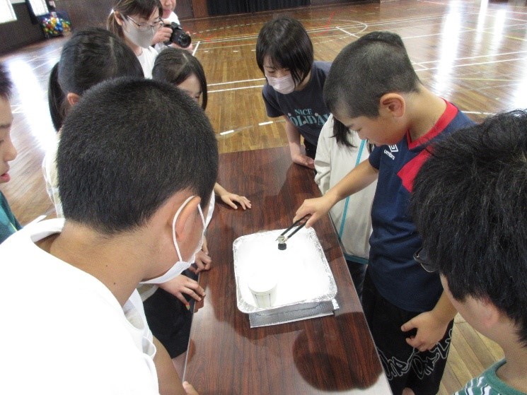 7月3日(水)に科学実験教室を行いました。4年生は「ホバークラフト制作」、5年生は「液体窒素と超電導」について、実験から学びました。一つ一つの実験に「ええ!?」「なんで!?」「すごーい!!」と大興奮の子どもたちで興味津々でした。大きい風船が空気の力で落ちなかったり、ホバークラフトを作ってみんなで競争したり、風船の輪をくぐったり・・・五感をたっぷり使って学べた良い経験でした。感想にもそれぞれが感じた「なぜ?」「楽しかった!」がたくさん書いてありました。日ごろから子どもたちが感じること、「なぜ?」もぜひ大切にしていってほしいです。子供達の振り返りでも「楽しく学べた。」という子がほとんどで、今回も体験的に学ぶ機会があり、のめりこむように実験を見ながら「なぜ?」を学んでいました。「え!?」「すごい!」と自然と声に出している姿は、子供達が、科学を学びたいと感じるからこそ出てくる言葉ですね。