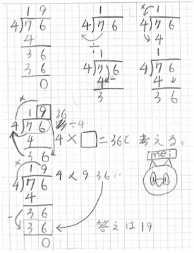 【4年生】わり算の筆算 4年生の算数では、「わり算の筆算」を学習しています。【たてる→かける→ひく→おろす】と一つずつ計算していくのがとても大切で、子どもたちは工夫しながらノートにまとめていました。友だちにやり方を説明したり、ポイントを確認したりして繰り返し学んでいます。 ホームページ管理者2025-08-11T13:05:46+09:002024年06月03日|